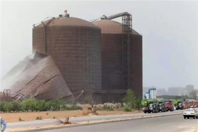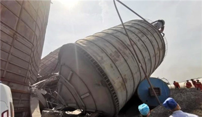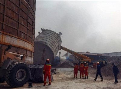 位于山西省晉中市榆次區(qū)修文鎮(zhèn)郭村S102省道旁的榆次區(qū)萬寶德隆新型建材有限公司,一直徑25米、高50米的儲存粉煤灰倉發(fā)生傾倒,致相鄰的2個(gè)較小罐體和部分廠房受損,傾倒之后導(dǎo)致相鄰的兩個(gè)較小的罐體以及部分廠房受到了損毀,7名工人被困。