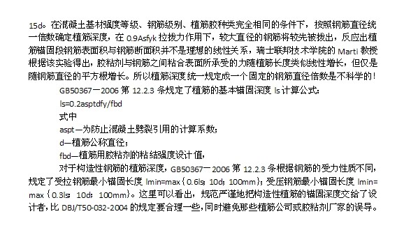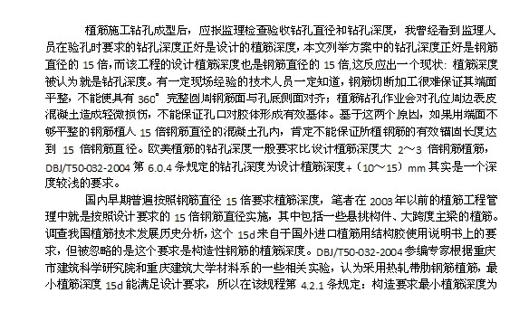 植筋施工鉆孔成型后,應(yīng)報(bào)監(jiān)理檢查驗(yàn)收鉆孔直徑和鉆孔深度,在驗(yàn)孔時(shí)要求的鉆孔深度正好是設(shè)計(jì)的植筋深度,鉆孔深度正好是鋼筋直徑的15倍,而該工程的設(shè)計(jì)植筋深度也是鋼筋直徑的15倍,這反應(yīng)出一個(gè)現(xiàn)狀:植筋深度被認(rèn)為就是鉆孔深度。有一定現(xiàn)場(chǎng)經(jīng)驗(yàn)的技術(shù)人員一定知道,鋼筋切斷加工很難保證其端面平整,不能使具有360°完整圓周鋼筋面與孔底側(cè)面對(duì)齊;植筋鉆孔作業(yè)會(huì)對(duì)孔位周邊表皮混凝土造成輕微損傷,不能保證孔口對(duì)膠體形成有效基體。基于這兩個(gè)原因,如果用端面不夠平整的鋼筋植入15倍鋼筋直徑的混凝土孔內(nèi),肯定不能保證所植鋼筋的有效錨固長(zhǎng)度達(dá)到15倍鋼筋直徑。歐美植筋的鉆孔深度一般要求比設(shè)計(jì)植筋深度大2~3倍鋼筋植筋,DBJ/T50-032-2004第6.0.4條規(guī)定的鉆孔深度為設(shè)計(jì)植筋深度+(10~15)mm其實(shí)是一個(gè)深度較淺的要求。