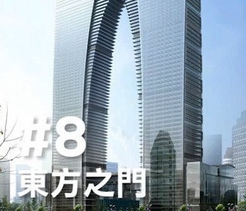 8、東方之門。盡管開發商表示,建筑設計概念是來自于蘇州的水陸城門,不過郝毅博說,這根本就是一件站在空中的大褲子嘛!