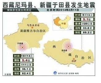 北京時間2月11日9時15分,在西藏自治區(qū)那曲地區(qū)尼瑪縣(北緯33.8度,東經(jīng)89.2度)發(fā)生5.1級地震,震源深度20公里。