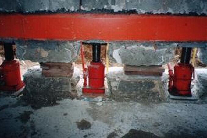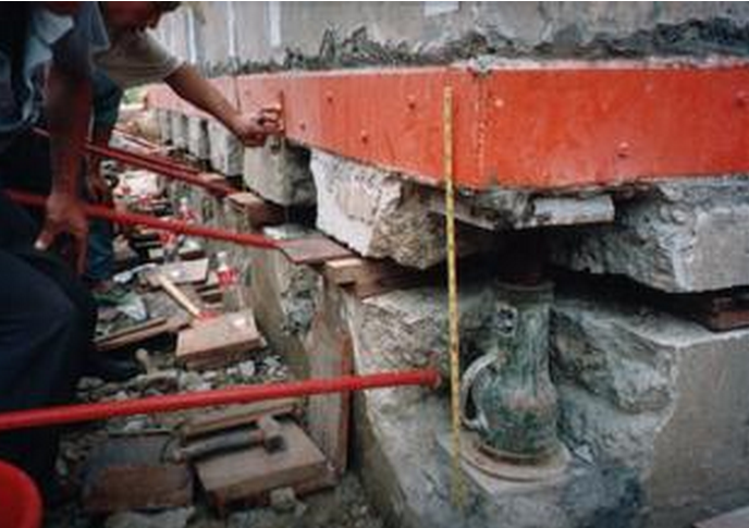 屋傾斜糾偏和加固。 用千斤頂對托換加固樁進行預試使房屋傾斜得到加固。在托換加固樁上用千斤頂頂升沉降的基礎使沉降的基礎復位直至房屋傾斜得到扶整。