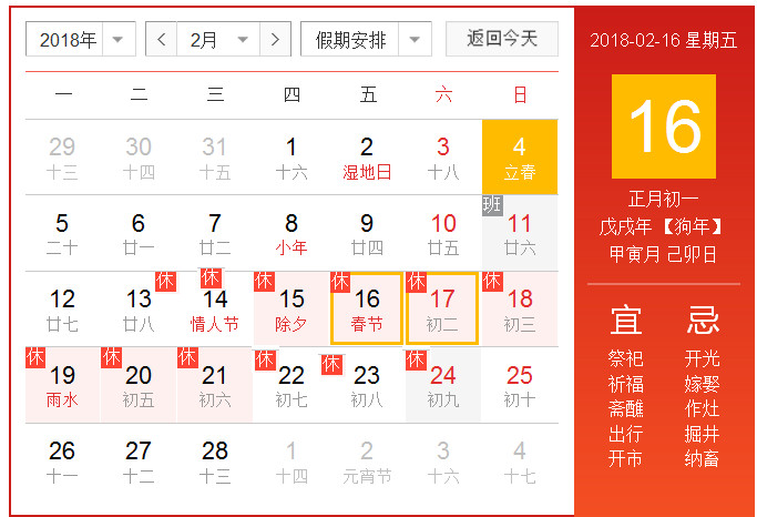 正值中國傳統(tǒng)節(jié)日“春節(jié)”來臨,在此向各位新老客戶和廣大朋友們拜個早年!預(yù)祝大家新春愉快、財源廣進、生意興隆、宏圖大展!按照本公司通知規(guī)定,2018年春節(jié)放假調(diào)休時間為2月13日至2月25日,共12天。 2月11日(星期日)、2月24日(星期六)為上班日。