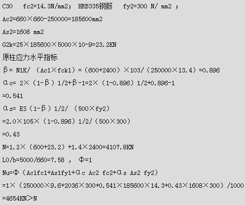 如:某中心受壓柱,高H=5 m,截面5 0 0m m×5 0 0m m,原結構混凝土強度設計等級C 4 0,共配8Ф1 8,承受軸向荷載標準值恒載G k=6 0 0KN,活載Q k=2 40 0KN,由于施工質量問題,經檢測結構檢測柱混凝土強度等級為 C2 0,要求對該柱進行加固。
